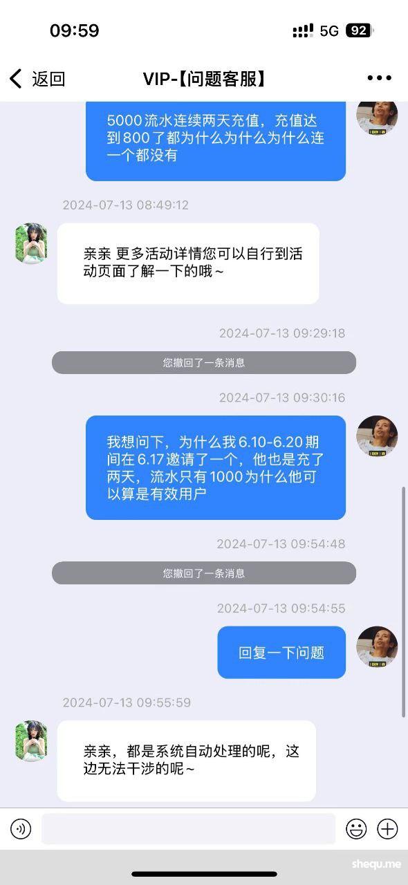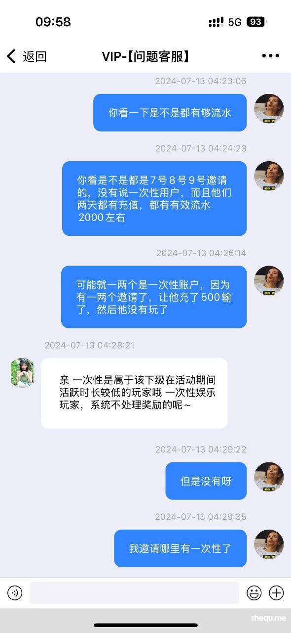 我在南宫邀请了15个有效新用户,大部分都是7号和8号9号邀请的,都有连续两天充值,并且达到了500以上,有效流水大部分都有2000以上有些5000,到现在结算的时候说我的是一次性用户,系统不给我发放礼金,全部给我黑了,一共22500元,我在6.10-6.20期间的17号也拉了一个人,他在18号充值和19号充值,总共流水1000,他的情况和我上面15个人的情况一模一样,但是他发放了礼金,到了另一个周期,我拉了15个人,现在却是以各种理由不给我发放礼金,大家看清南宫,不要去南宫拉人了,你拉人拉的多不会给你礼金发放的