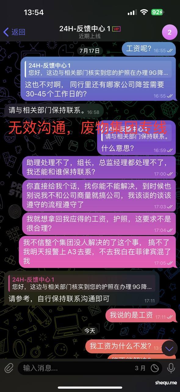 本人是此集团前Aseana 3 商务部门KM包网员工,欧洲杯之前公司出规定最后在职日期必须为7月15日之后,刚开始也是想遵守公司规定,提出干完欧洲杯结束再离职,然后主管经理即便是干完欧洲杯再走也不批你OA,强制给你转岗到铂金做招商,后续7月1日当天和新部门沟通实在不想做,当天辞退回去。 现在离职已经在外面等了18天,护照不给,咨询那个狗专线就说在走流程,降签,让我等30-45个工作日。 试问同行里还有哪家公司离职需要在外面等这么久的? 我问旅行社都说降签半个月之内就好。 多方找人沟通无果,迫于无奈只能曝光了,然后这个公司以此为由直接拒发工资,现在是护照不给,工资也被黑。 0赔自带9G来给你干了大半年,离职你搞得我护照也没工资也没,现在回国回不了,去别处上班也没护照。行,光脚不怕穿鞋的,现在结果再坏也无所谓了。老子不报警找NBI上A3当面和你要算我来菲律宾白混这么多年,你觉得你名声已经够臭无所谓,死猪不怕开水烫那就来。