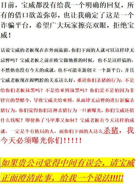 故事的起因在今年3月份,本人经过朋友推荐认识一个宝威平台名叫波导的代理,欧洲杯期间由于一开始上下分都非常正常,并且波导给我大量的平台优惠政策,想我投注量流水更大,当时本人觉得对自己来说无伤大雅,所以就按照他的要求对宝威平台进行充值。 建立在信任宝威平台的前提下,我加大了投注量,但从7月份开始,平台开始找各种理由借口拖延提款的时间,但好在名为波导的高管,都会在第一时间及时处理这些问题,并且得到了有效的解决,导致我越来越信任他,且进行了大金额充值,从而慢慢的掉入宝威精心谋划的陷阱....