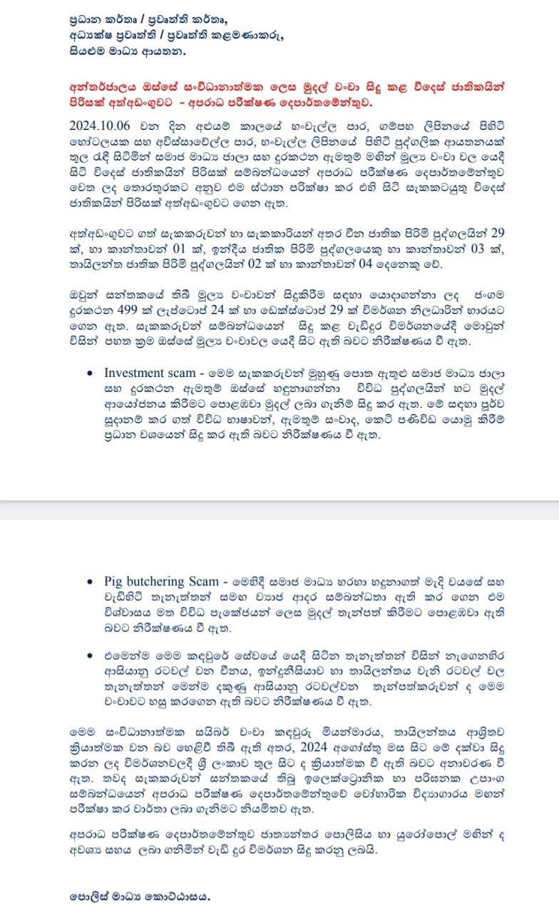 上周日,警方逮捕了 40 名居住在斯里兰卡、涉嫌参与网上金融诈骗的外国人。