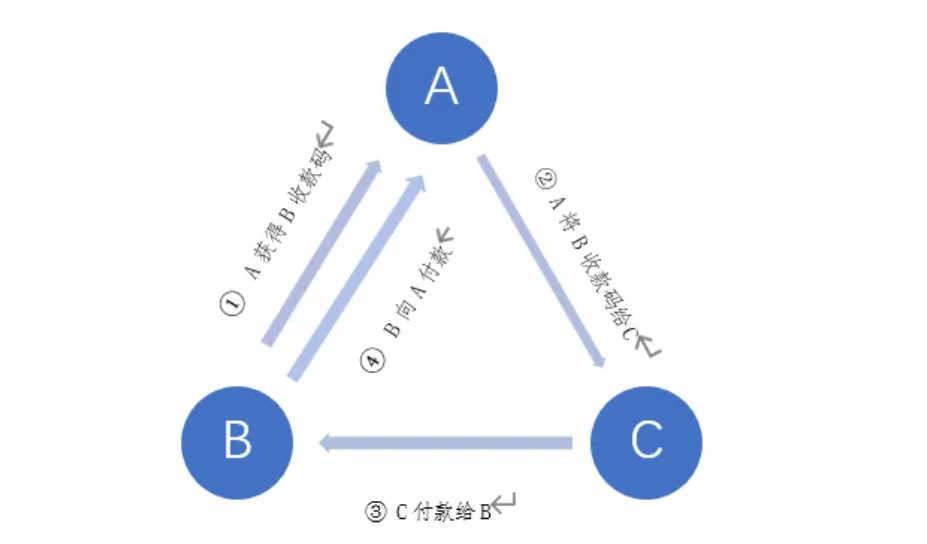 这种洗钱方式存在的诈骗行为也很多,俗称“ABC骗局”,例如A声称自己需要换钱找到B,约定好报酬之后,A从微信/支付宝将本金+报酬付给B,B从支付宝/微信将本金付给A。但实际上,A为骗子,以买卖游戏账号、游戏道具等原由与C进行交易,A获得B的收款码之后,将B的收款码给C,C将本金和报酬付款后,B将本金付给A,由于很多时候ABC仅通过贴吧、论坛或者其他软件进行沟通,并没有对方实际的联系方式,若C被骗后警方最先找到的也是B这个实际收款人,且由于游戏账号直款(不通过游戏交易平台或者中介,直接收付款)交易金额相对较小,有时金额可能未达到诈骗案件金额2000元,导致C只能吃哑巴亏。具体的流程图如下: