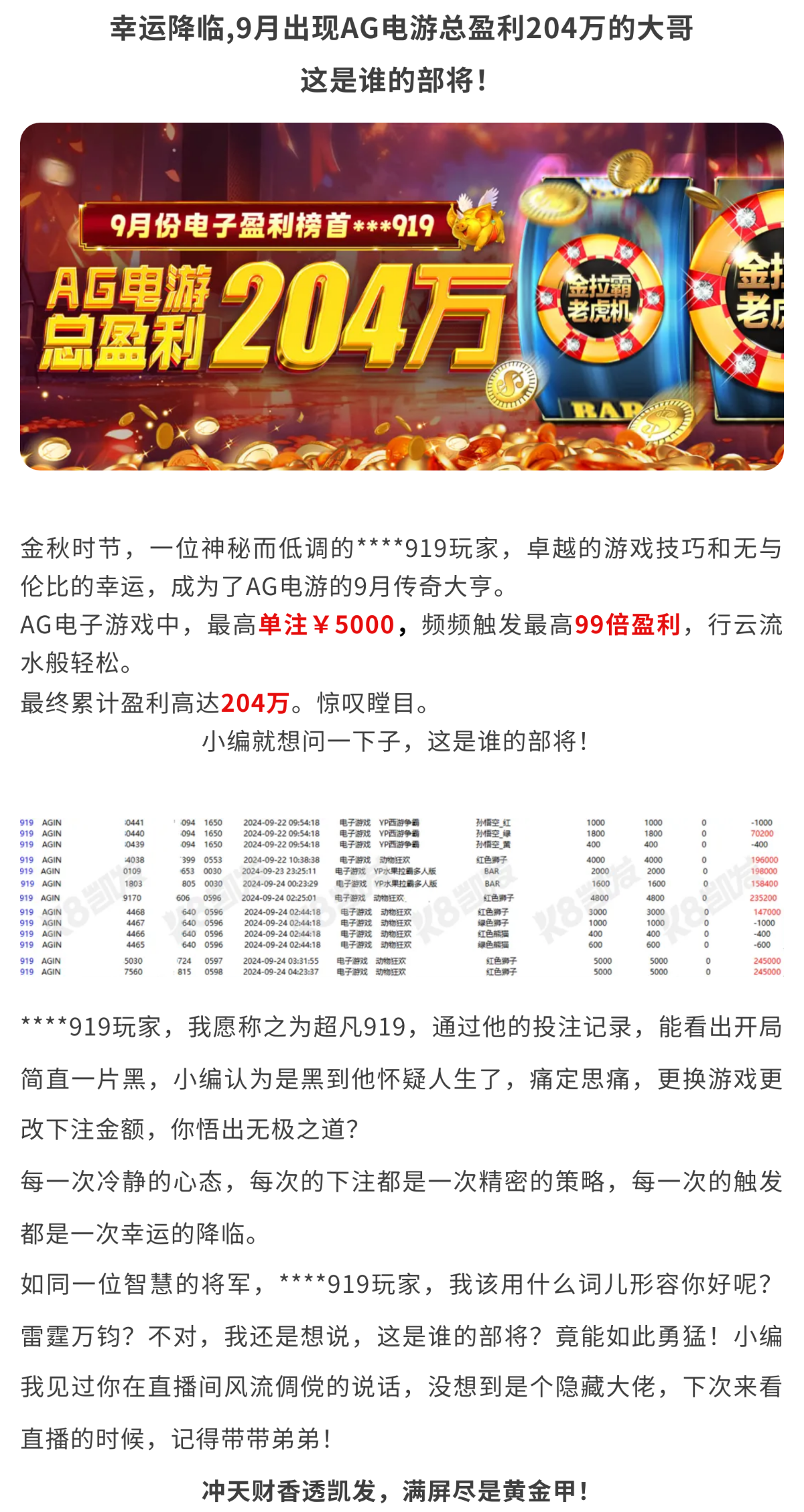 9月出现AG电游总盈利204万的大哥 这是谁的部将!